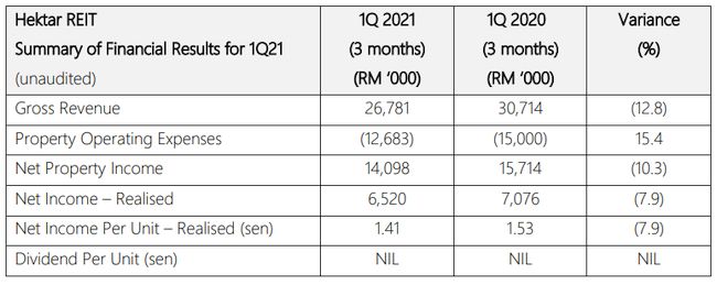 Hektar REIT recorded revenue of RM26.78 million, which is 12.8% lower than the RM30.71 million recorded in the same quarter of the preceding year. The reported revenue fell mainly due to the rental income, carpark income and lower hotel occupancy, consistent with other retail and hospitality REITs that were affected because of the pandemic outbreak and implementation of mobility restrictions. Net property income of RM14.09 million for the quarter decreased by 10.3% compared to the RM15.71 million recorded in 1Q 2020. Realised income for the quarter was RM6.52 million, which is 7.9% lower than the RM7.08 million recorded in 1Q 2020. Earnings Per Unit ("EPU") of 1.41 sen was recorded for the first quarter.