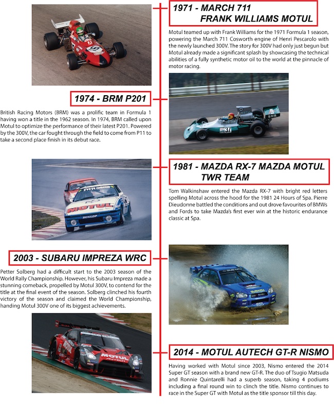 在1971 年之前,Motul 已积极参与赛车运动,为众多车队赢得比赛提供动力。受 Motul 第 300 次胜利的启发,Motul推出全新300V 品牌的全合成机油。虽然这款机油今天可以在商业市场上购得,但 300V 最初是专为赛车应用而调配的,以合成基础油和酯类添加剂完美地协同动力和可靠性。这项名为 ESTERCore ® 的技术突破使 300V 能够在极端条件和持续压力下保持表现,甫推出即获得完美的胜利机油的赞誉。多年来,300V 已被世界各地许多车厂的赛车队采用,确保他们的赛车从比赛开始到结束都保持极限表现。