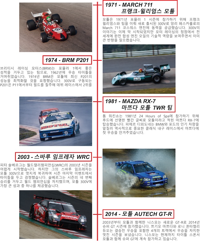 Motul은 1971년 세계 최초의 완전 합성 에스테르 기반 윤활유인 300V를 출시하면서 윤활유 업계의 선구자로 떠올랐습니다. 이 새로운 등급의 윤활유는 엔진 오일의 최첨단 기술을 통해 달성할 수 있는 것에 대한 패러다임 전환을 이끌었습니다. 모튤은 혁신적인 제품을 만들었을 뿐 아니라 레이스 트랙에서 전례 없는 성능과 신뢰성을 보여주었습니다. 지난 50년간 300V는 큰 발전을 이루면서, 레이싱 챔피언들의 선택을 받았고, 전 세계에서 많은 우승을 향한 길에서 최고의 제조업체들의 추천을 받아왔습니다. 300V 브랜드의 반 세기를 마무리하는 2021년은 모튤에 있어 중요한 이정표입니다. 오늘 모튤은 이 플래그십 제품의 빛나는 여정을 기념합니다.