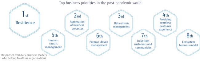 Resilience is perceived as the top business priority in the post-pandemic world. The survey results indicate that many organizations have understood the importance of a flexible response in the face of changes in an uncertain world. Many respondents also noted the importance of business process automation, data-driven management and a seamless customer experience where online merges with offline.