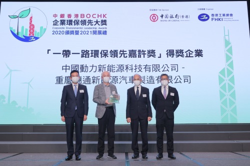 科轩动力主席张韧先生(左二)代表公司附属公司中国动力新能源科技有限公司及重庆穗通新能源汽车制造有限公司领取一带一路环保领先嘉许奖2020