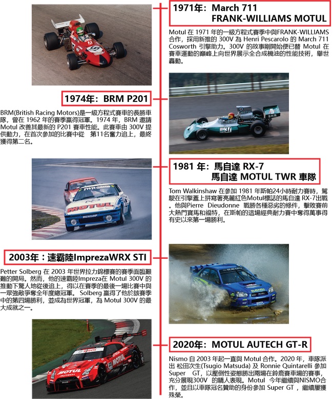 150 多年來,Motul 因其產品質量、創新能力和所參與的競爭領域而獲得一致認可,同時也是公認的合成機油專家。 早在 1971 年,Motul 就採用當時只應用在航天科技的酯類技術,推出300V 潤滑油,成為開創 100% 合成機油配方的首家潤滑油製造商。2021 年標誌著 Motul 300V 的 50 週年誕辰。