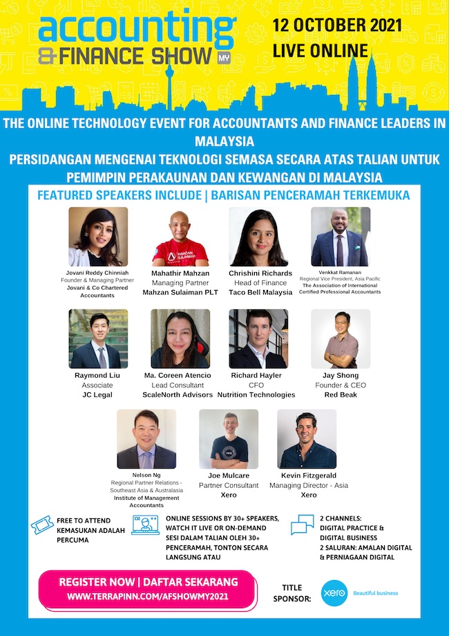 Details of the one-day virtual event are as follows: Accounting & Finance Show Malaysia 2021 12 October 2021 | Virtual Free-to-Attend Website: https://bit.ly/3uMkoJa Register: https://bit.ly/3A9d8Ic Agenda: https://bit.ly/3Ae5xIy