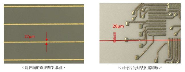 ・通常在丝网印刷中,50㎛左右的线宽被认为是印刷极限,但是通过将适用本膏材的印刷机和网版进行组合,不仅可在被认为较难进行细线印刷的玻璃上,还能在PET薄膜(※3)及绿片(※4)等其他基材上直接印刷细微配线(30㎛以下)。因此,有助于用于次世代汽车的玻璃加热器、用于5G的透明天线等要求具有穿透性的电子装置的较高性能化和提高生产性。