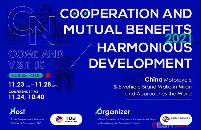 On November 24, a promotional event, "Cooperation and Mutual Benefits / Harmonious Development: China Motorcycle and E-vehicle Brand Walks in Milan and Approaches the World", sponsored by the MOFCOM and organized by the China Chamber of Commerce for Import and Export of Machinery and Electronic Products (CCCME), kicked off with a press conference in the main EICMA exhibition venue.