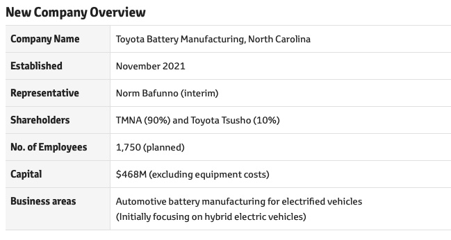 In addition, as the company continues its efforts to reach carbon neutrality for its vehicles and operations by 2050, Toyota is committed to using 100% renewable energy at this new facility to produce the batteries.