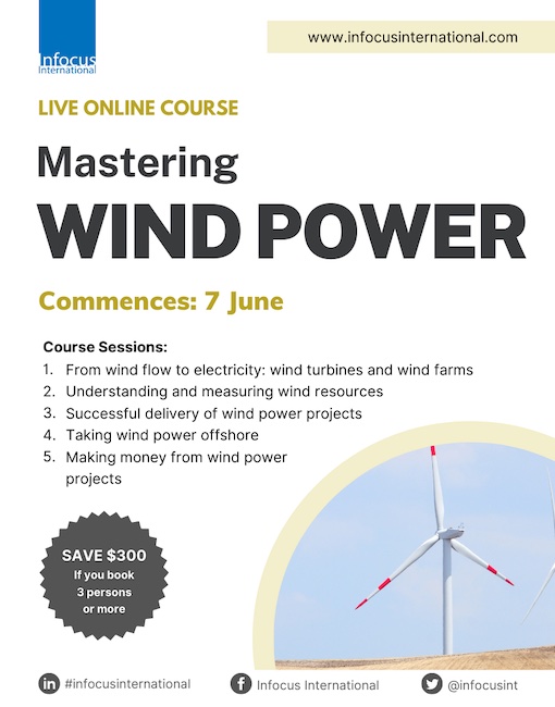 Infocus International Group, a global business intelligence provider of strategic information and professional services, has announced the new dates for Mastering Wind Power training and it will be commencing live on the 7th of June 2022. A comprehensive, up-to-date and business-focused roadmap to success in delivering wind power growth, today and tomorrow.