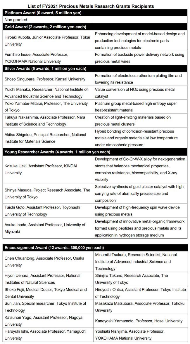 Five Silver Awards, four Young Researcher Awards, and 12 Encouragement Awards were also granted. The recipients and an overview of the Precious Metals Research Grants are indicated below. Applications for the FY2022 research granted are scheduled to open in the fall.
