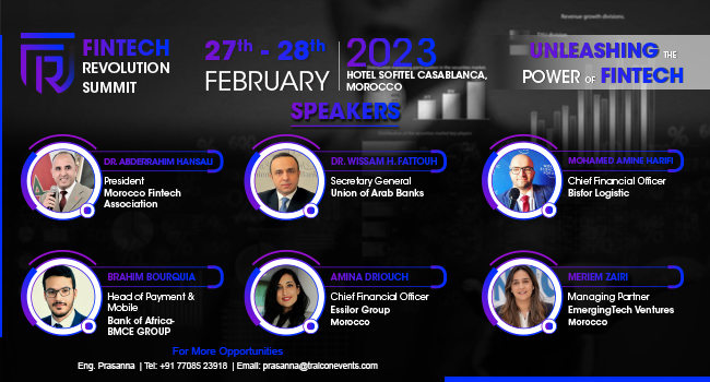 TraiCon Events will be hosting Morocco's premier fintech event titled as "Fintech Revolution Summit" supported by Union of Arab Banks scheduled on the 27-28 February 2023 at the Hotel Sofitel, Casablanca, Morocco. This forum will be attended by over top 300+ participants includes BFSI experts, fintech leaders, ministry & central bank authorities, investors & corporates across the Morocco.