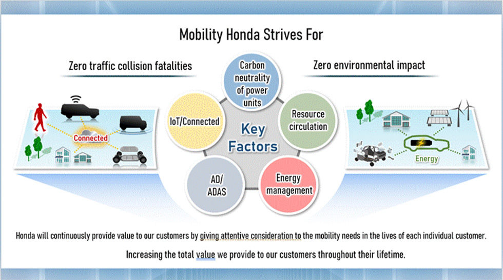 Honda strives to realize the joy and freedom of mobility for people around the world with zero environmental impact and zero traffic collision fatalities involving Honda motorcycles and automobiles. In so doing, Honda wants to be a company that serves as a driving force for many people to realize their dreams and move our society forward. To achieve this challenging goal, Honda has been strengthening its business structure and will focus on the following areas, which Honda identifies as the five key factors for the advancement of mobility.