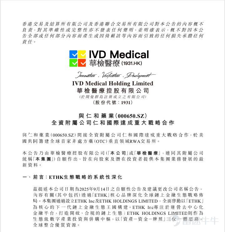 9月16日,华检医疗(01931.HK)发布公告宣布,公司与仁和药业(000650.SZ)之间接全资附属公司仁和国际达成战略合作,共同于美国筹建全球首个专注于非处方药(OTC)领域的垂直RWA交易所。