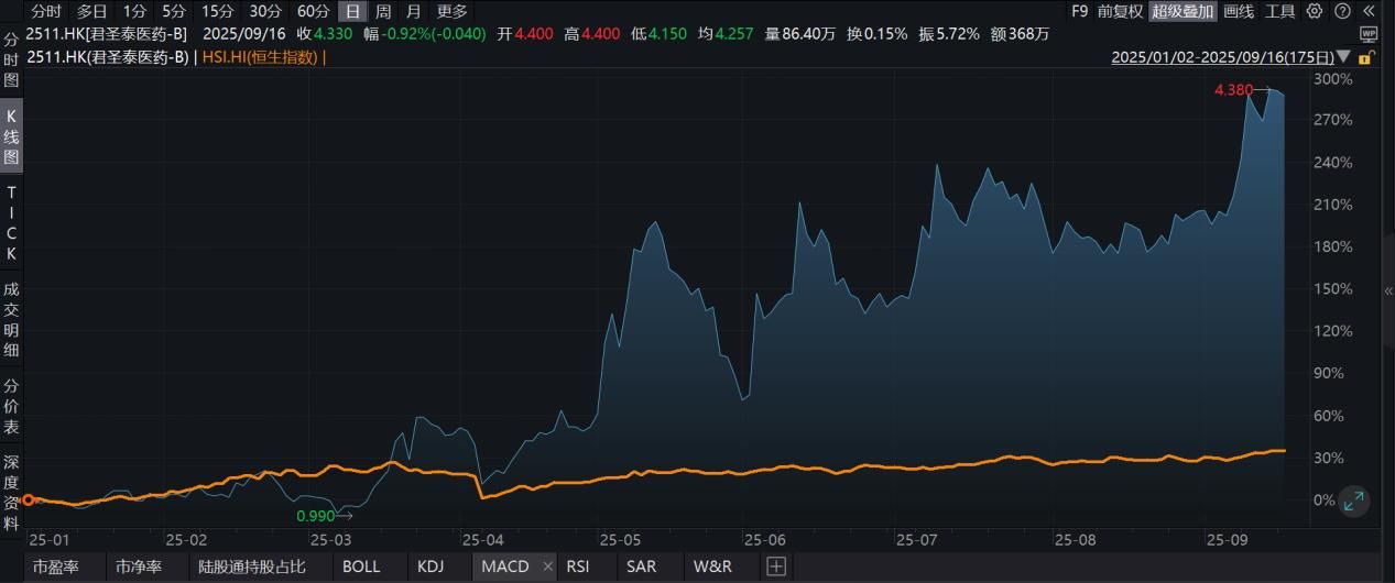 香港,2025年9月23日 - (亚太商讯) – 若要评选今年港股市场中表现最突出的板块,创新药无疑占据一席之地。在政策暖风持续吹拂下,港股18A公司整体走势强劲。根据WIND数据,截至2025年9月22日收盘,君圣泰医药(2511.HK)年内累计涨幅超过233.07%,成为市场中一道亮眼的风景线。